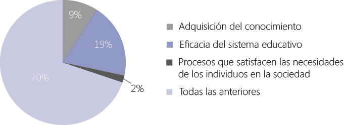 Se resalta la pregunta que indaga a los encuestados sobre su entendimiento de la calidad educativa, el cual evidencia que un 70% de ellos considera que los tres conceptos de respuesta son esenciales para el desarrollo de la calidad; los cuales son la adquisición del conocimiento, la eficacia del sistema educativo y los procesos que satisfacen las necesidades de los individuos en la sociedad.