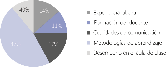 En este contexto, los estudiantes son los sujetos correctos para valorar la calidad de la educación brindada por la IES y por ello las instituciones deben de tener en cuenta los comentarios y observaciones realizadas por los alumnos para dar cumplimiento al mejoramiento de la calidad (Gento y Vivas, 2005). Otro aspecto a resaltar es la necesidad de una actualización académica continua por parte del docente (seminarios, diplomados, etc.), que permita mejorar sus habilidades y estrategias de enseñanza (Ospina, 2009), además de tener diferentes estudios y experiencia, es importante la metodología de aprendizaje que aplique, pues esta última es una de las cualidades consideradas por los encuestados (47%) como la más relevante y que incide en la calidad educativa, resaltándolo así como un factor importante de éxito para la docencia universitaria.