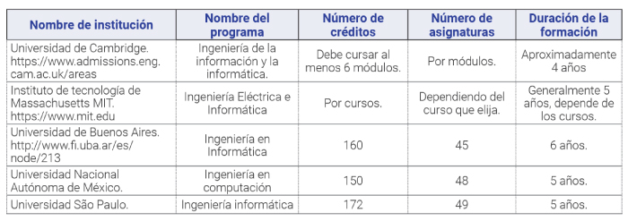 Teniendo en cuenta las verificaciones que a nivel Institucional se generan para determinar la viabilidad de un programa, teinco realiza este proceso por medio de una revisión de referentes internacionales, nacionales y regionales, evidenciado desde la búsqueda de información coincidente. En la Tabla 1, se observa la revisión de otras instituciones ubicadas en Europa, Asia y América como la Universidad de Cambridge, el Instituto de tecnologías de Massachusetts, la Universidad de Buenos Aires, la Universidad Nacional Autónoma de México y la Universidad de São Paulo; desde el nombre programa, créditos, asignaturas y duración de la formación, entre otros.