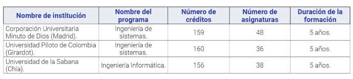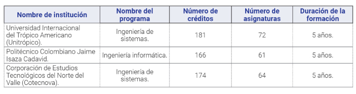 De igual forma, en la Tabla 2, se aprecia los referentes nacionales: Universitaria Internacional del Trópico Americano, Politécnico Colombiano Jaime Isaza Cadavid y Corporación de estudios tecnológicos del norte del valle; desde el nombre del programa, número de créditos, número de asignaturas y duración de la formación.