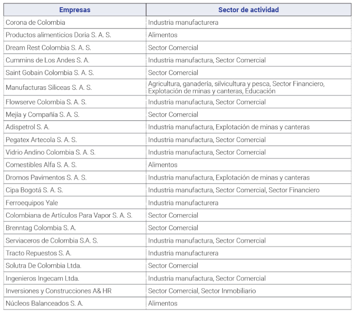 De acuerdo con la tabla 5, se cuenta con un total de 23 empresas establecidas en los siguientes sectores de la economía: agricultura, ganadería, silvicultura y pesca, sector financiero, explotación de minas y canteras, educación (1); alimentos (3); Industria manufactura, explotación de minas y canteras (2); industria manufactura, sector comercial (6); industria manufactura, sector comercial, sector financiero (1); sector comercial (6); sector comercial, sector inmobiliario, (1) respectivamente. Lo cual es relevante para continuar con el estudio debido a la diversidad de sectores.