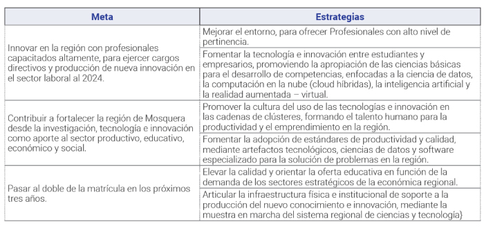 En este sentido, se establece una propuesta a mediano plazo que fortalecerá la actualización del currículo del programa de Ingeniería de Sistemas en la región de Mosquera, estableciendo metas específicas y estrategias que involucran el trabajo responsable entre el sector productivo, los organismos estatales y el sector educativo (Educación Media y Educación Superior), como se presenta en la siguiente Tabla 6, desde la innovación, investigación, tecnología y la oferta